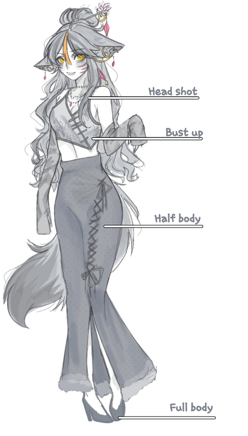 | PIE STYLE (half body): coloured 110$/greyscale 80$ |
